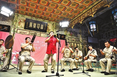 7月22日,非遺傳承人杜杏栓(右五)吹奏嗩吶。當(dāng)日,“山西忻州文化遺產(chǎn)精品展示月”系列活動(dòng)在北京恭王府開幕。新華社發(fā)